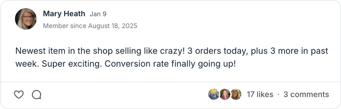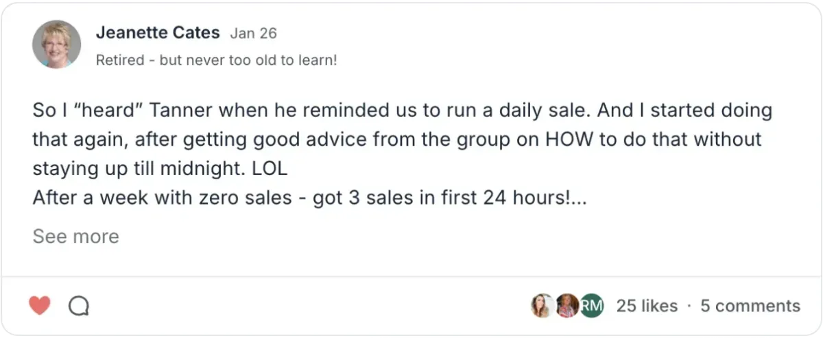 Established sellers often see the fastest results because they already have products and traction. The system helps you stop working hard for inconsistent returns and build momentum that compounds.
